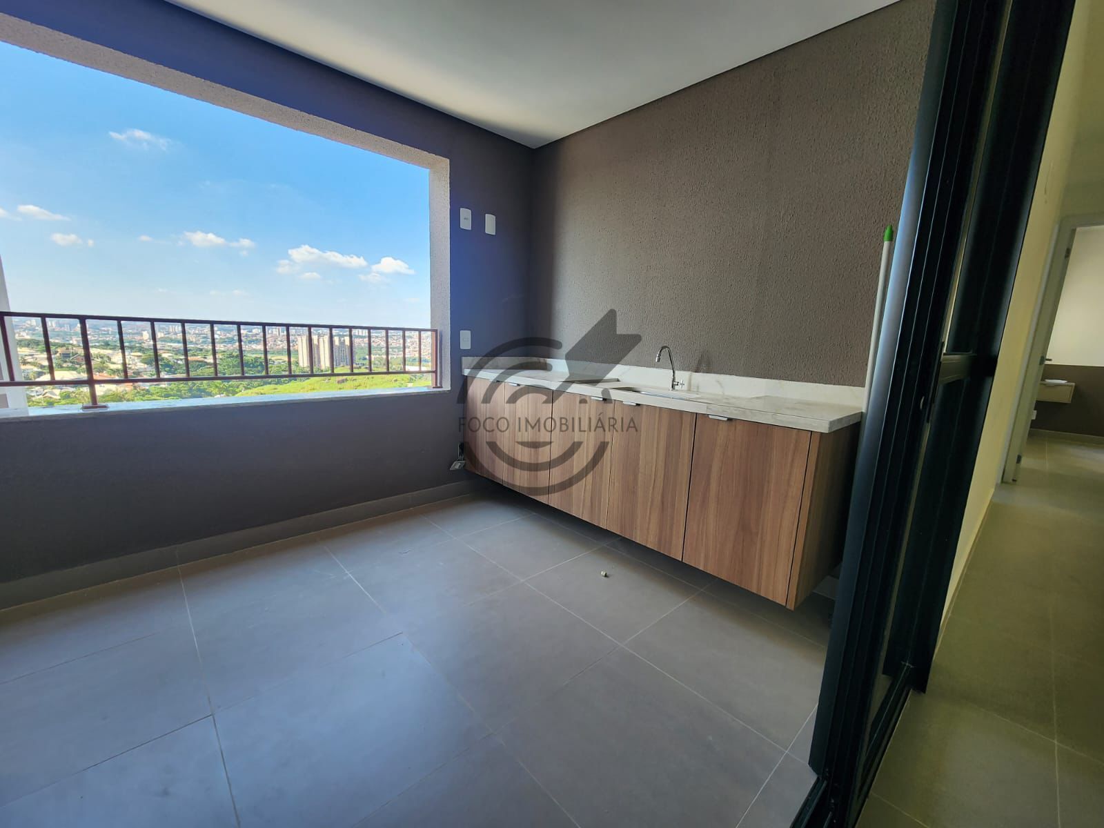 Varanda com armário e pia.